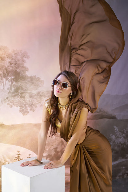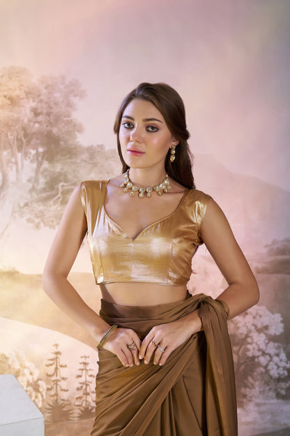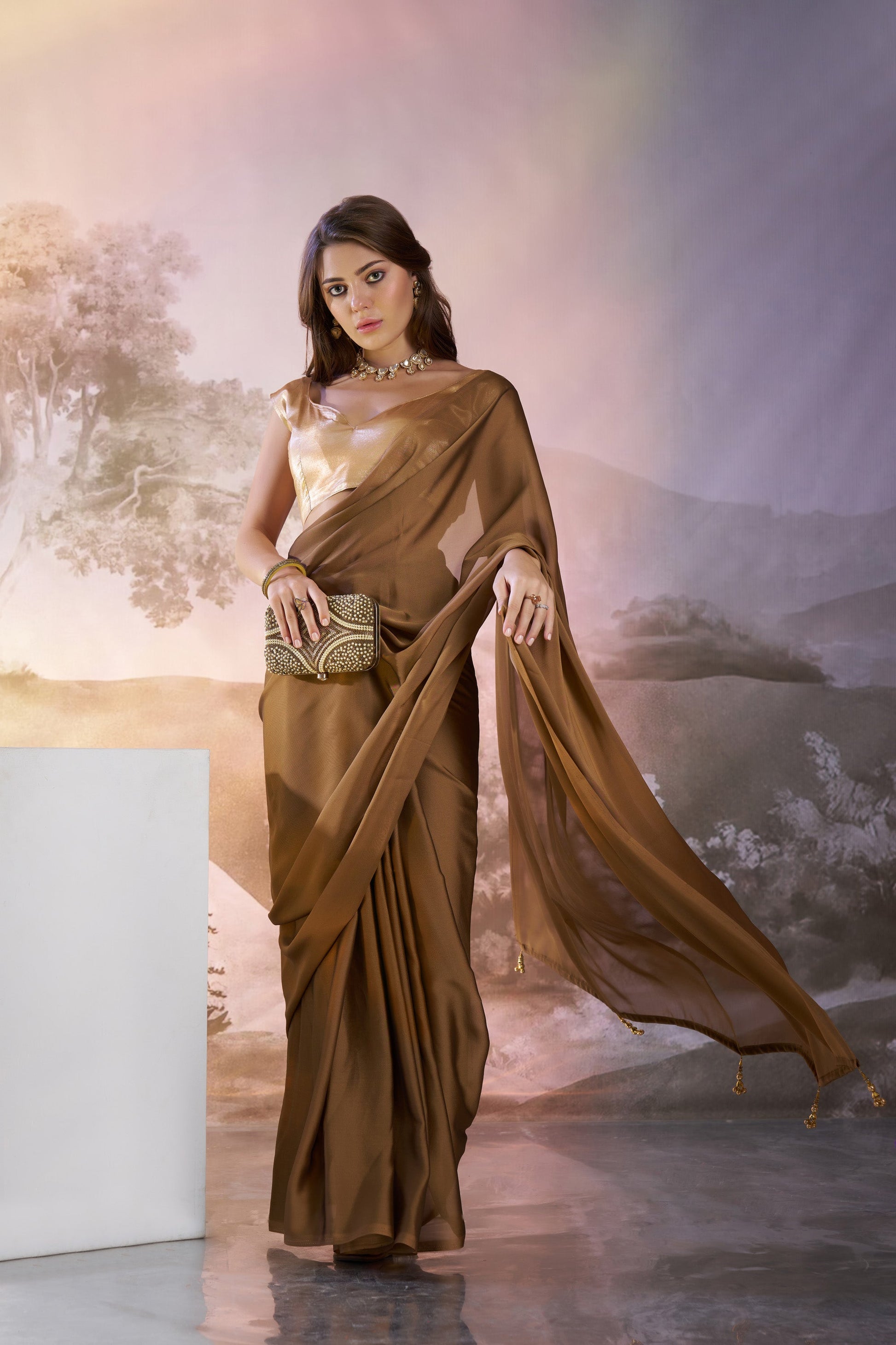 Brown Satin Rangoli Saree with Fancy Lace & Unstitched Blouse
