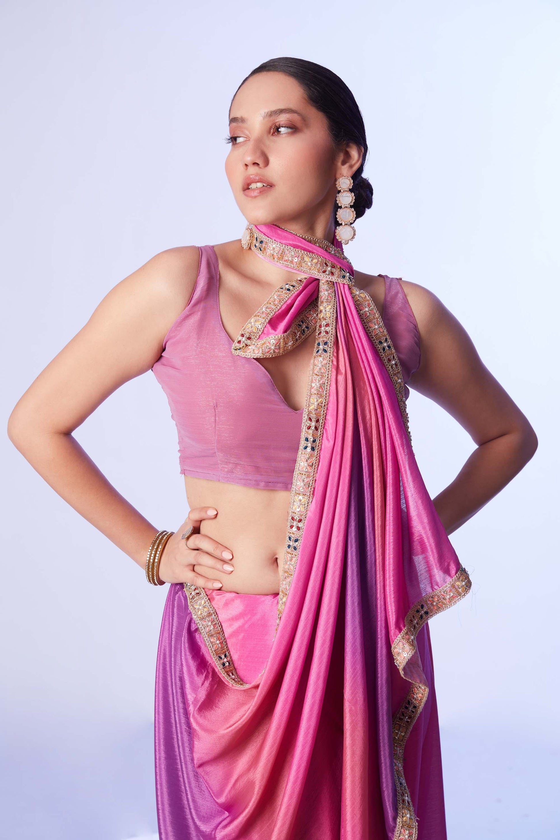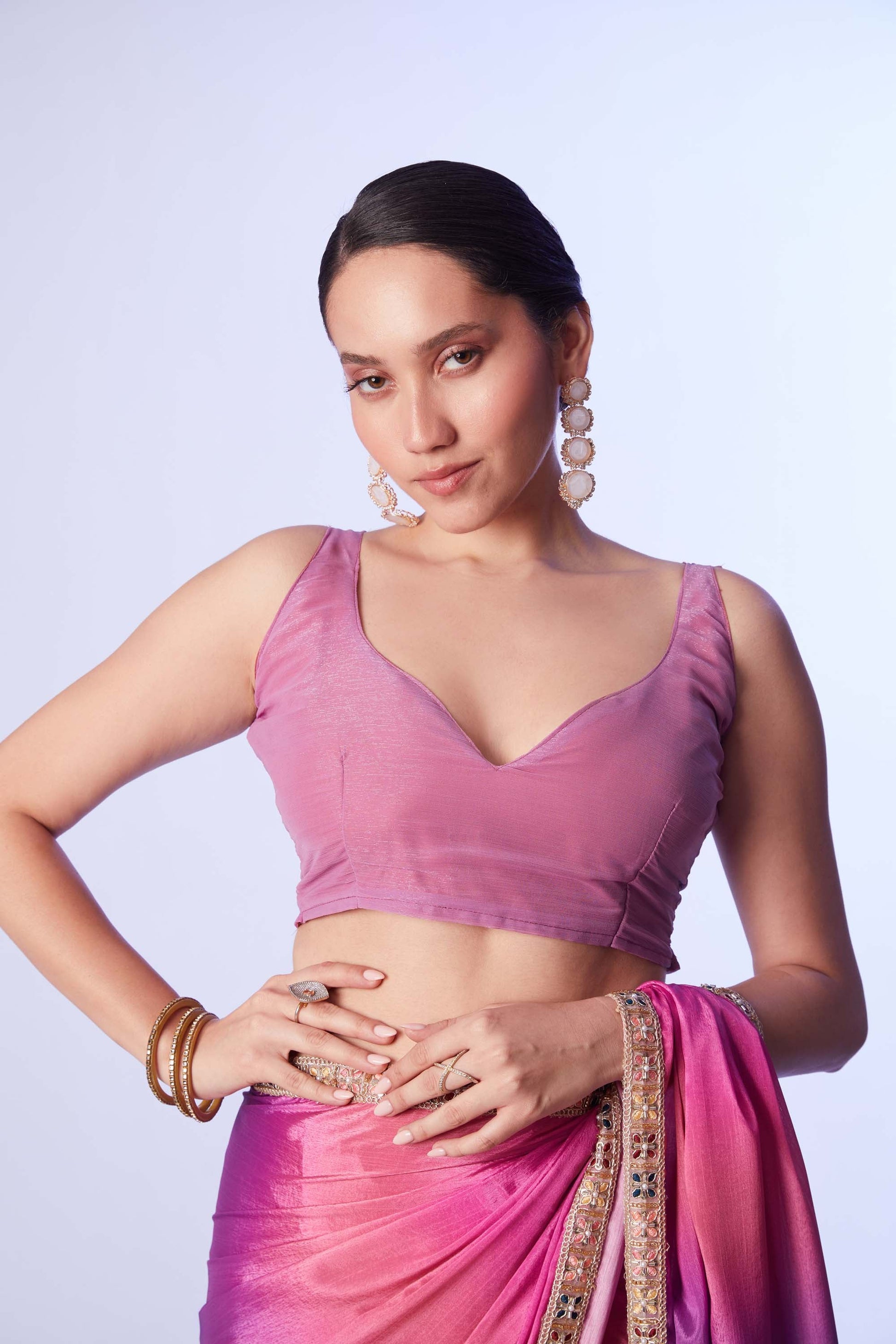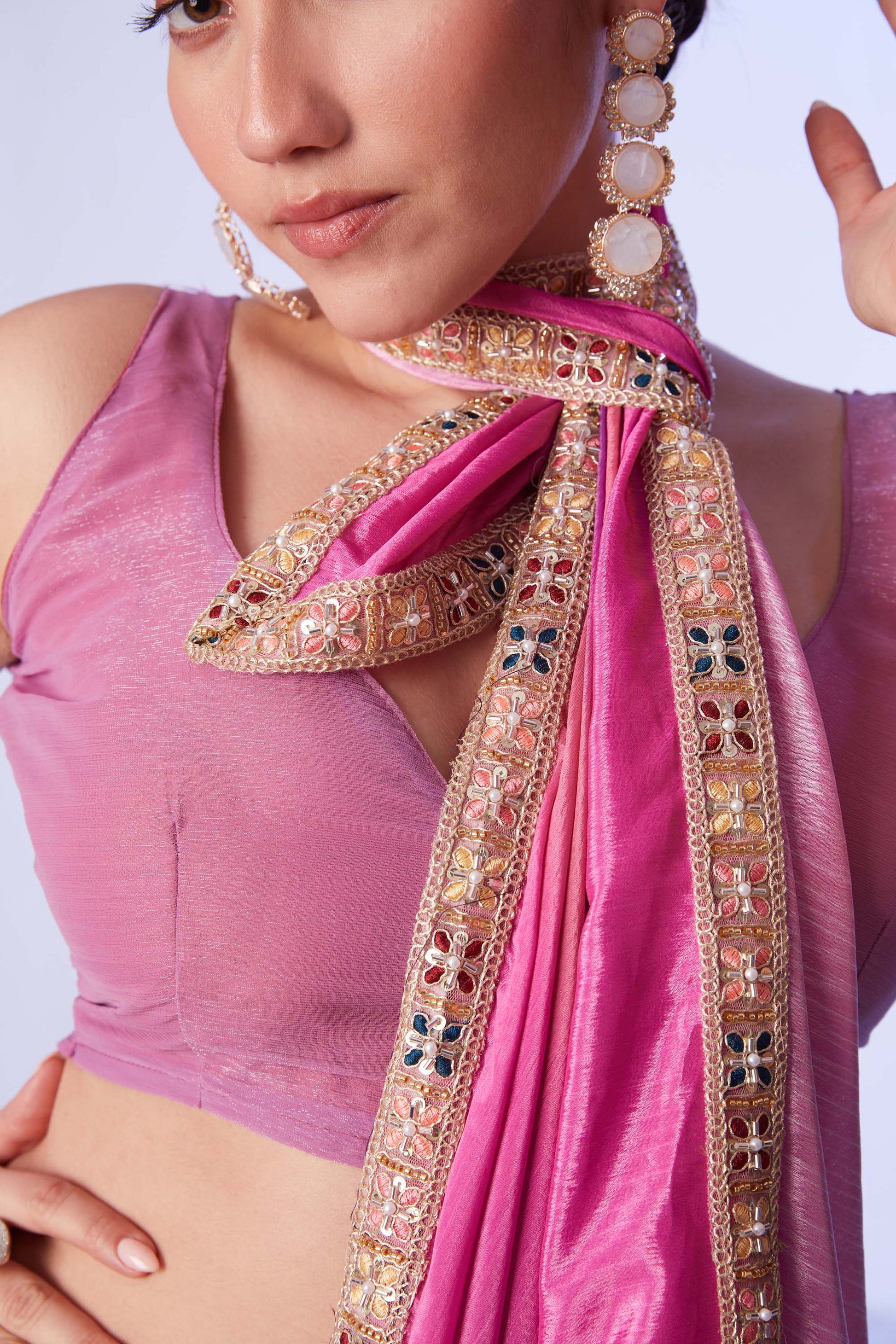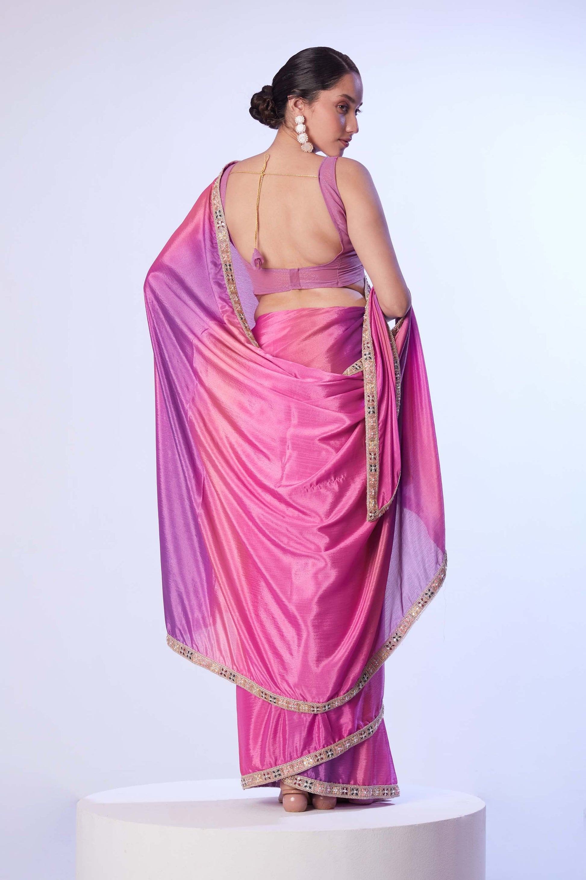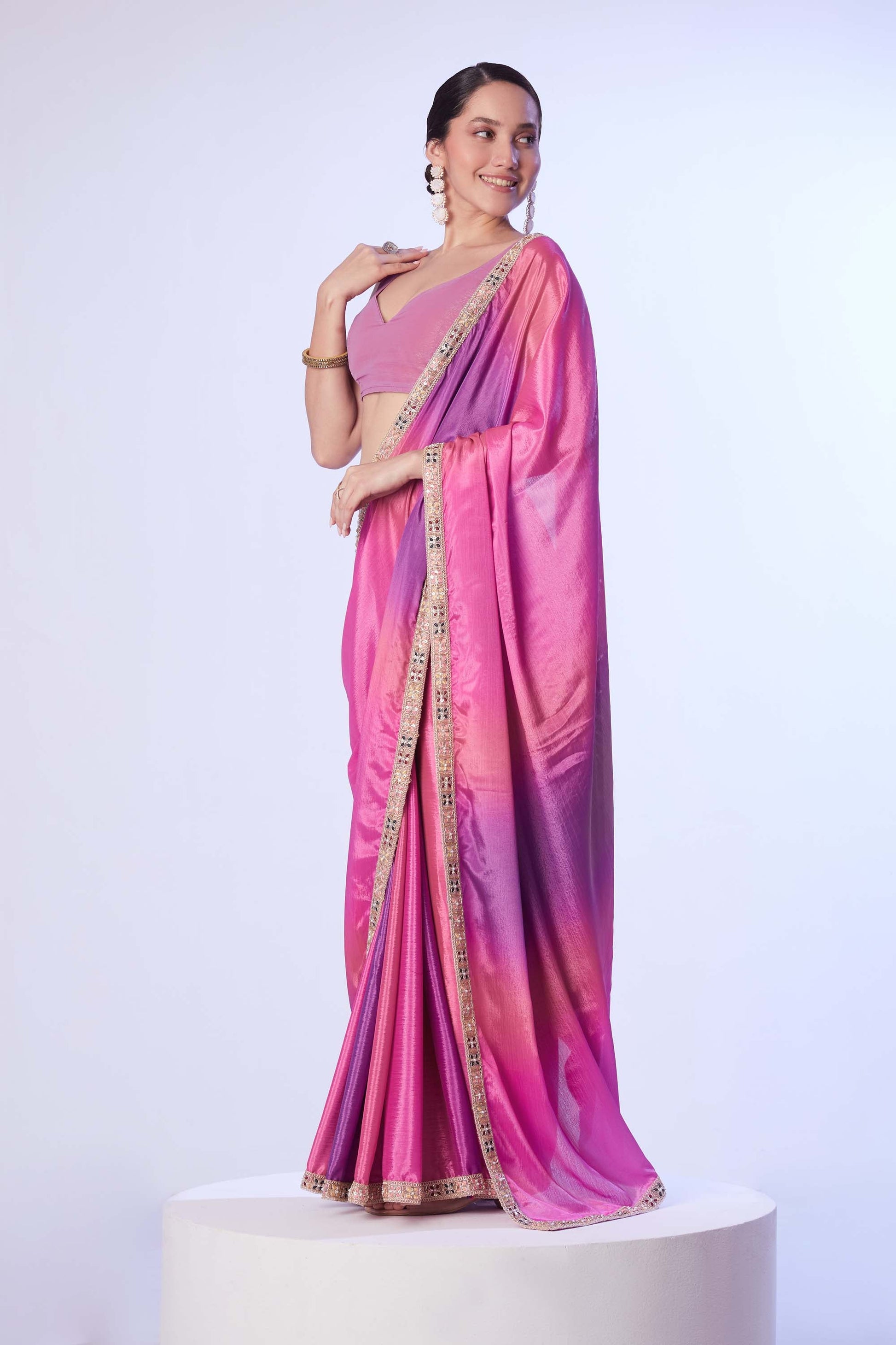 Chinon fabric digital printed saree with designer lace and unstitched blouse