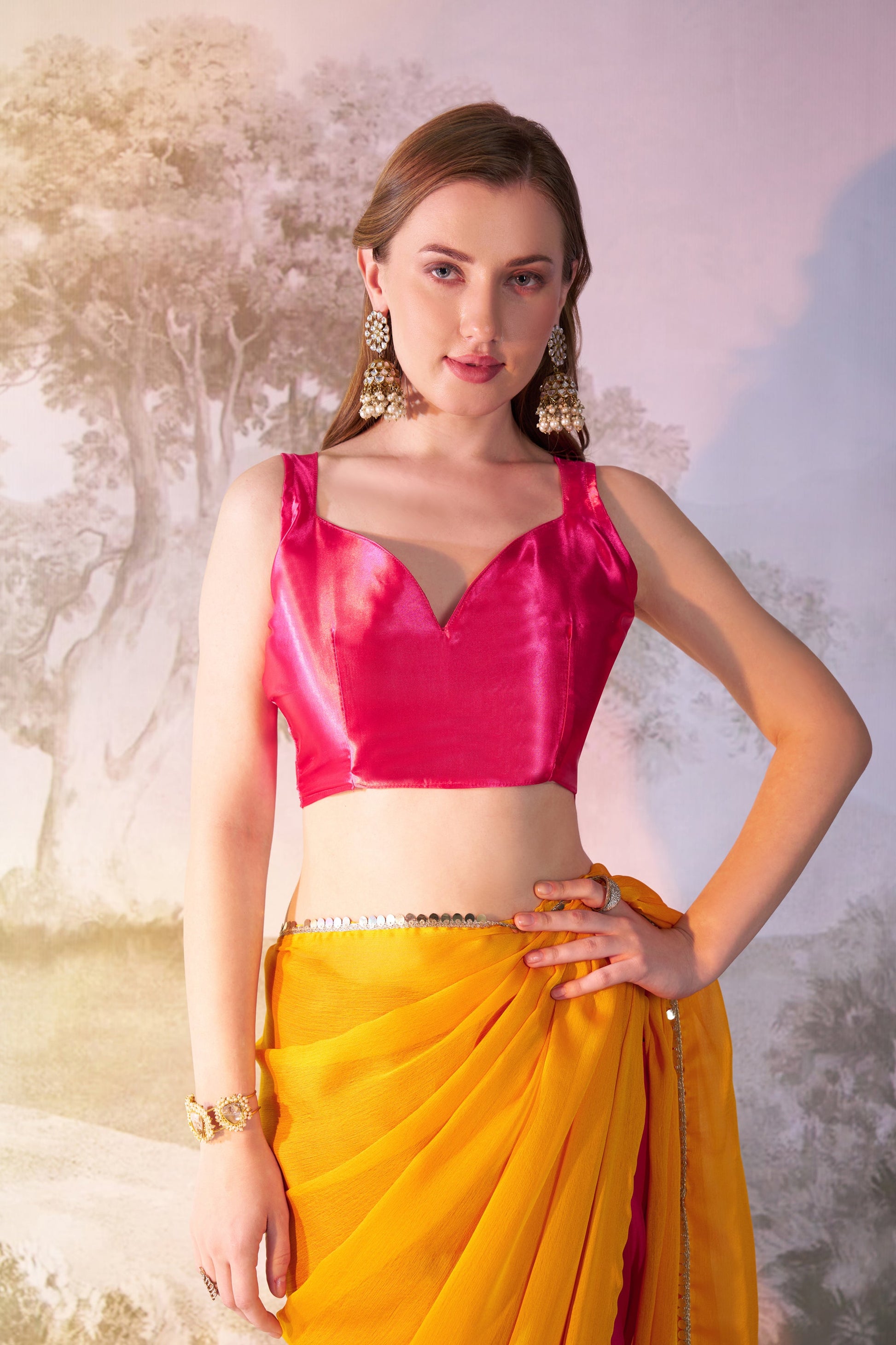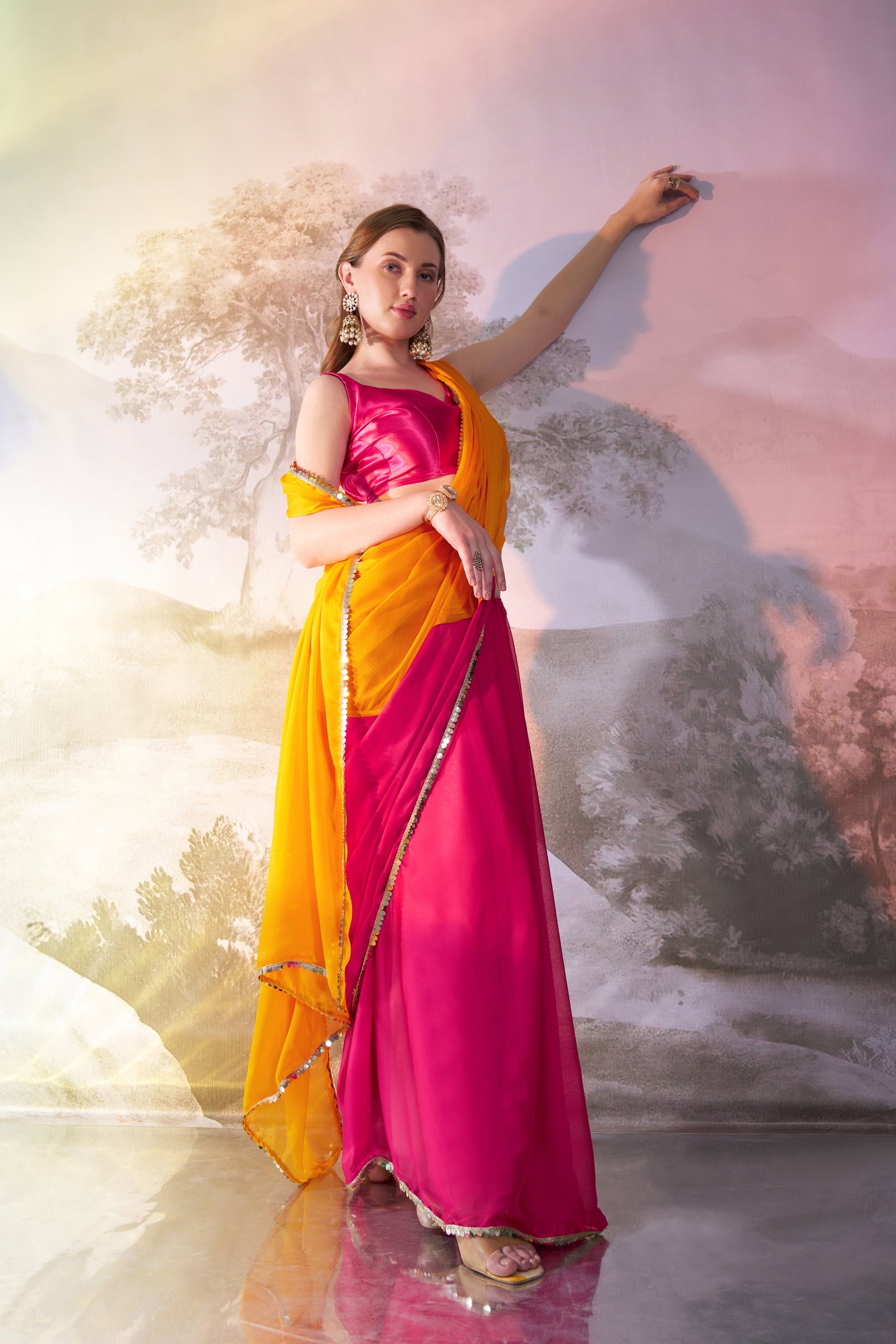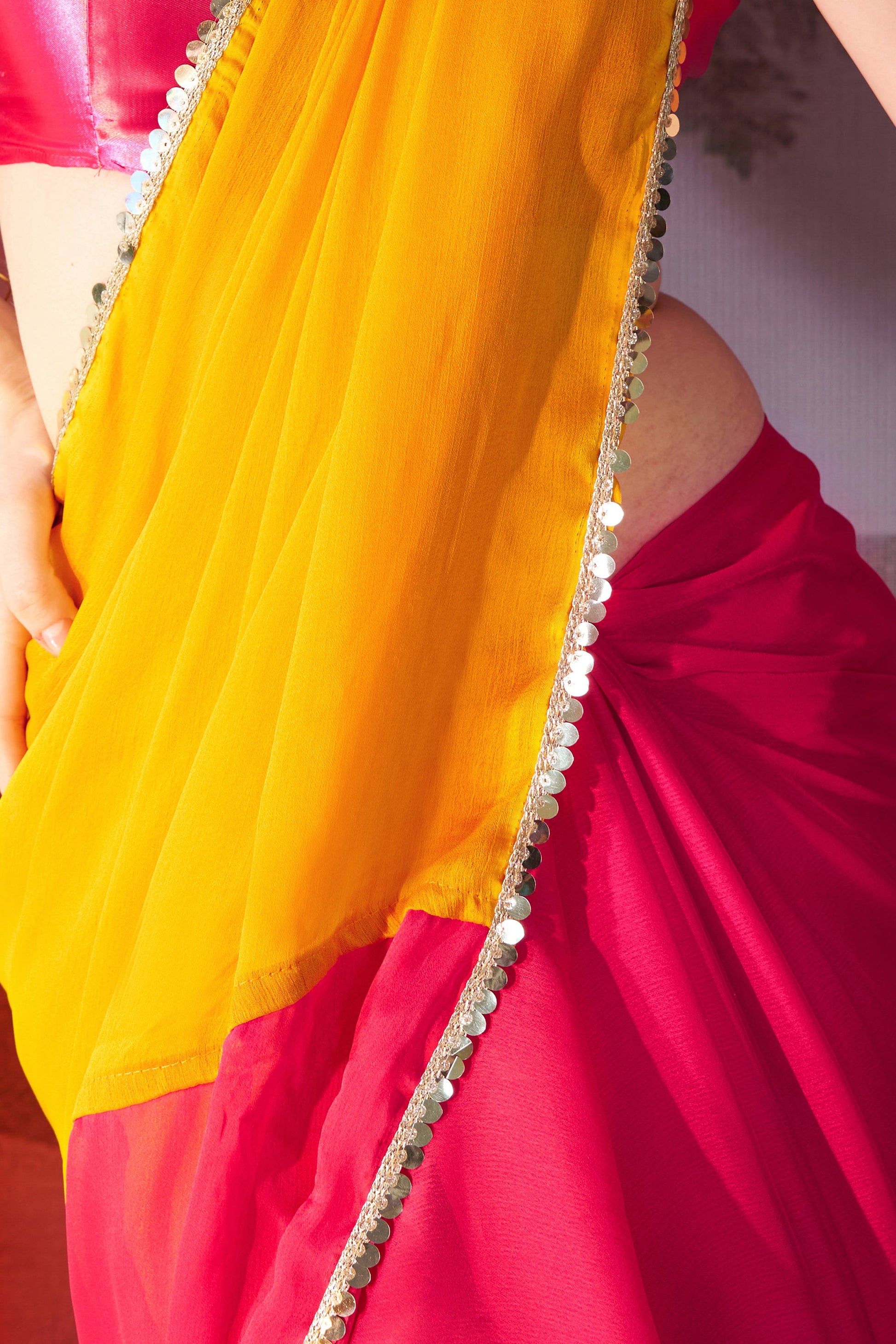 Musturd and Pink color chiffon fabric saree with designer lace and unstitched blouse