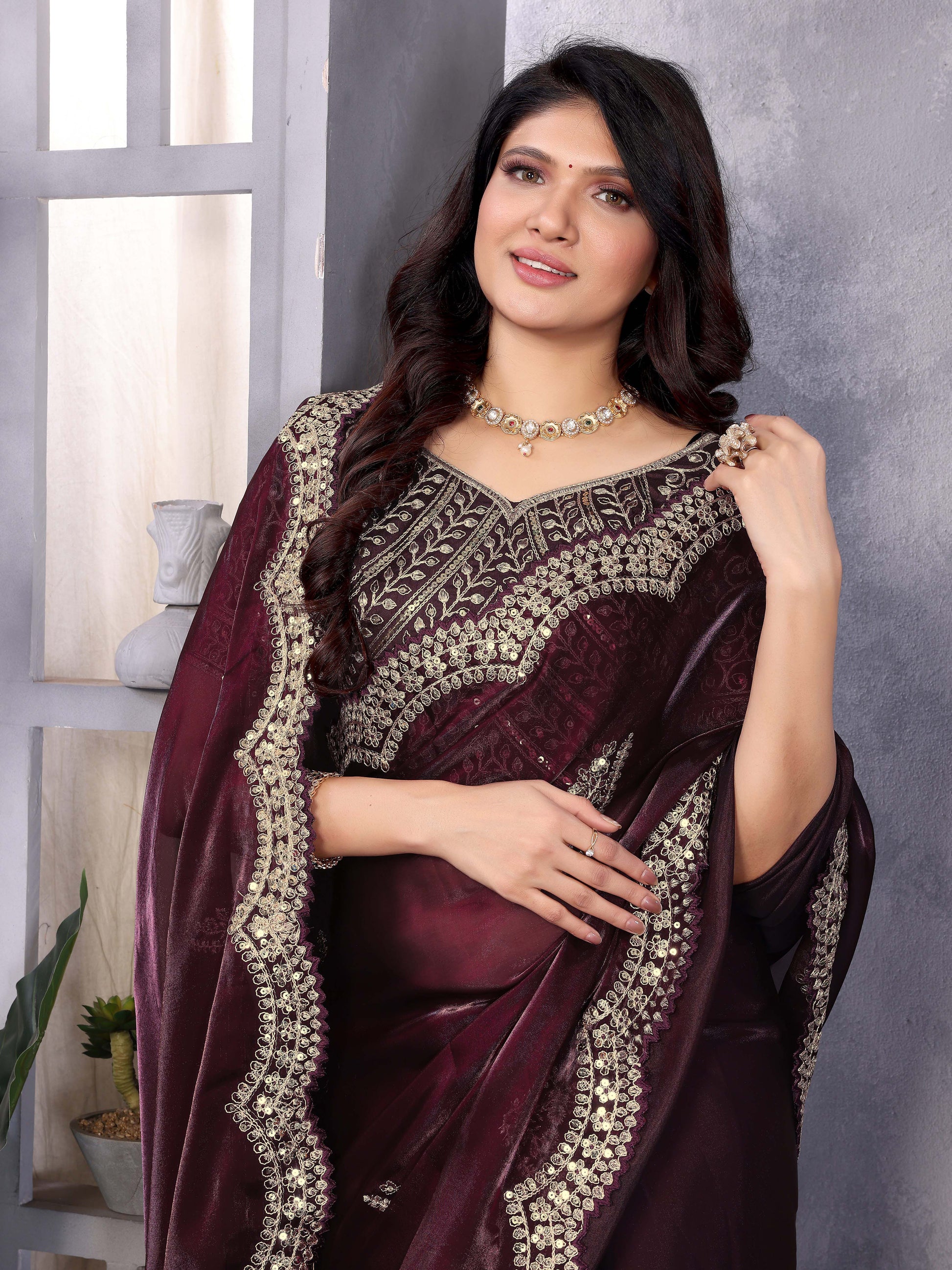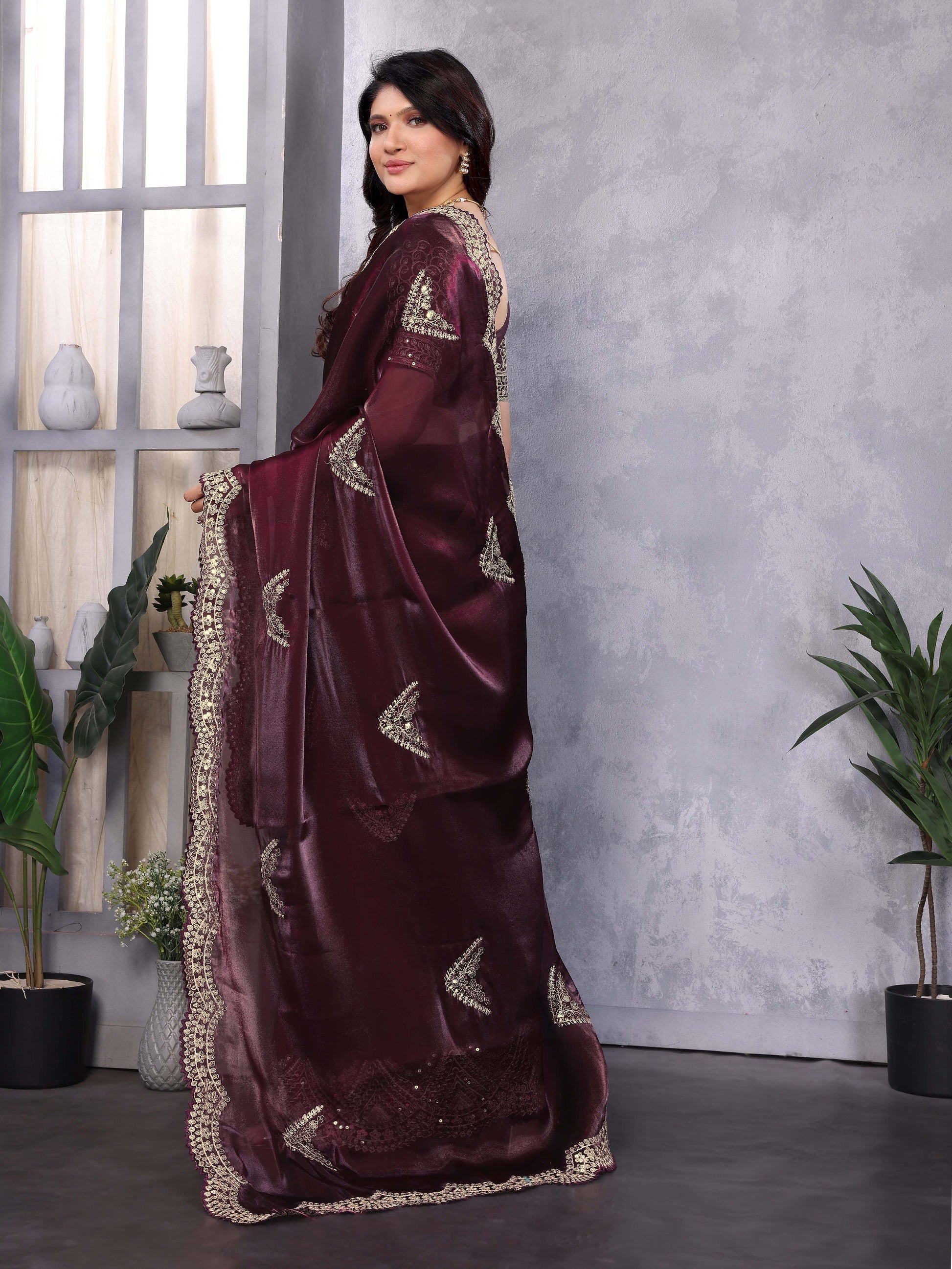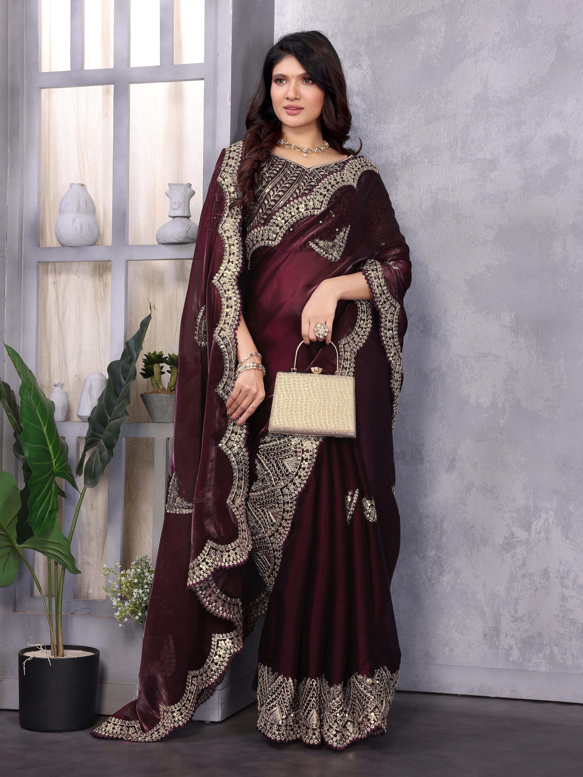 New Burgundy Color Chiffon Embroidery Work Party Wear Saree