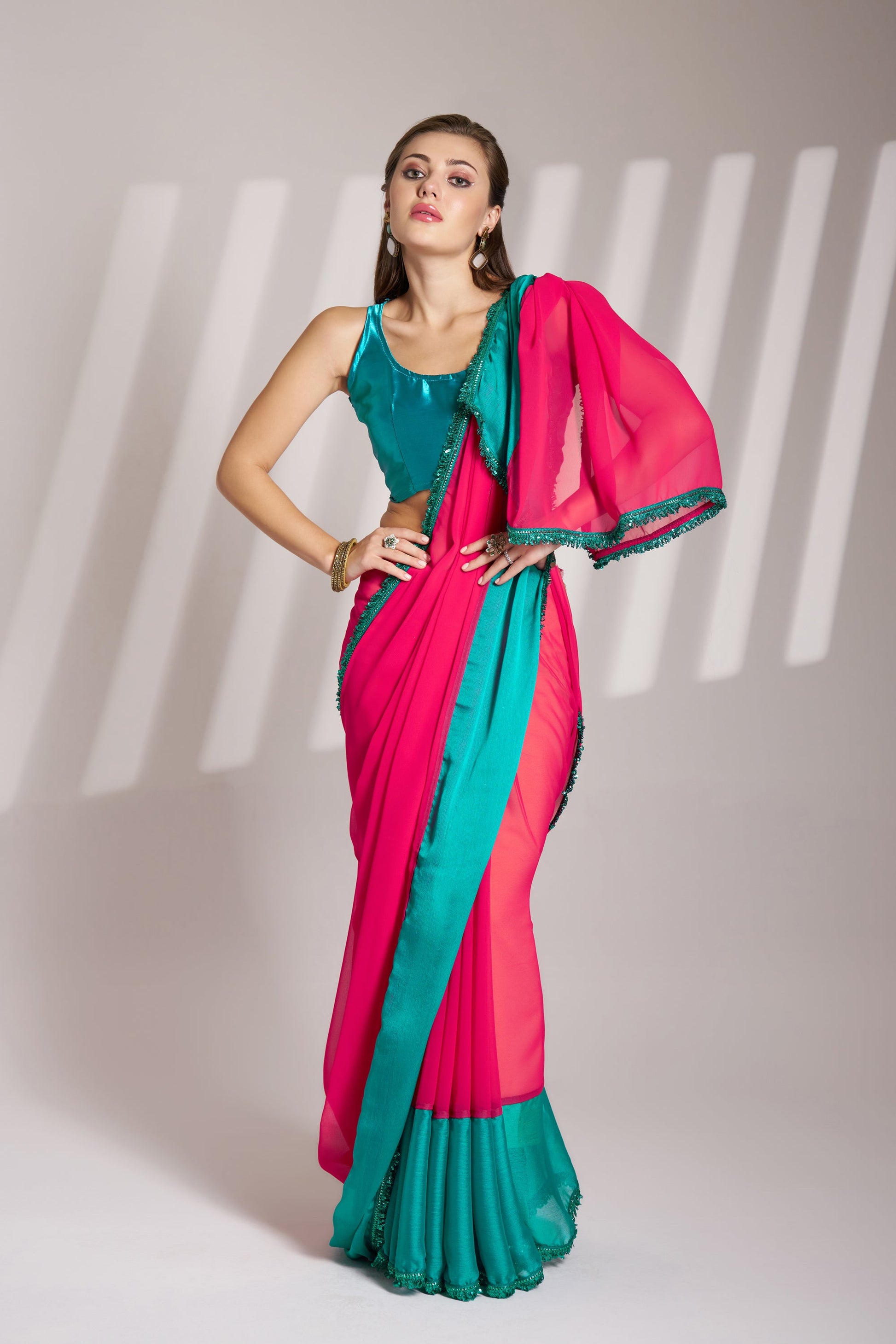 Stunning Georgette Saree in Crimson Red & Turquoise Blue with Designer Lace