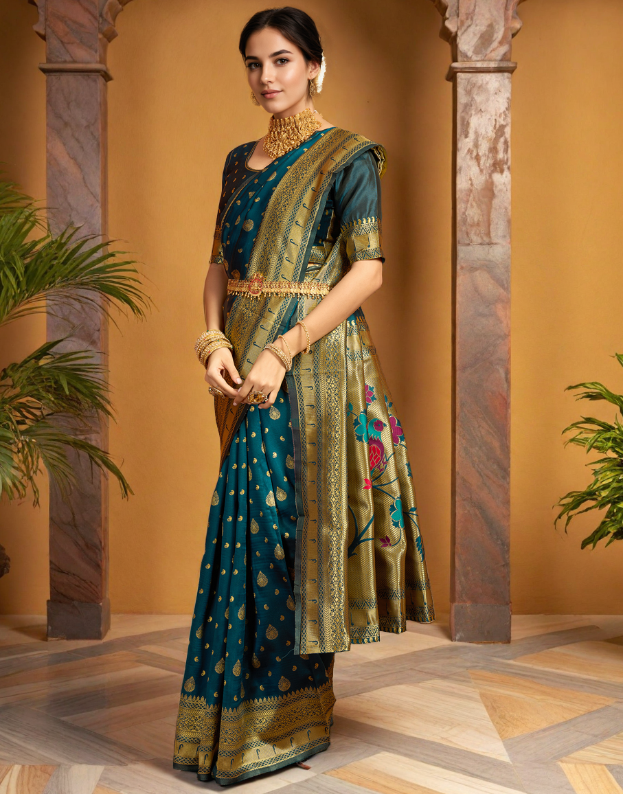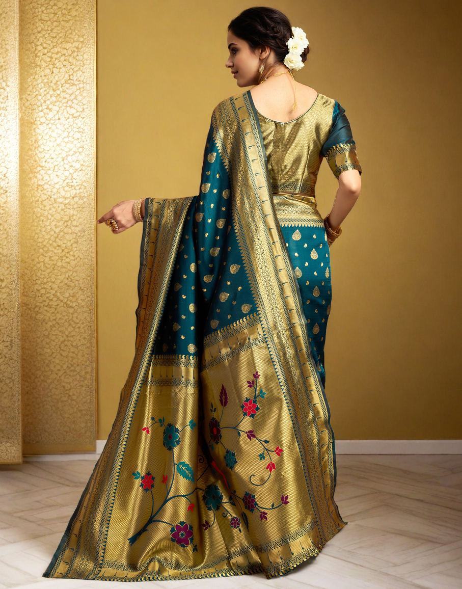 Teal Color Silk Weaving Paithani Work Designer Saree